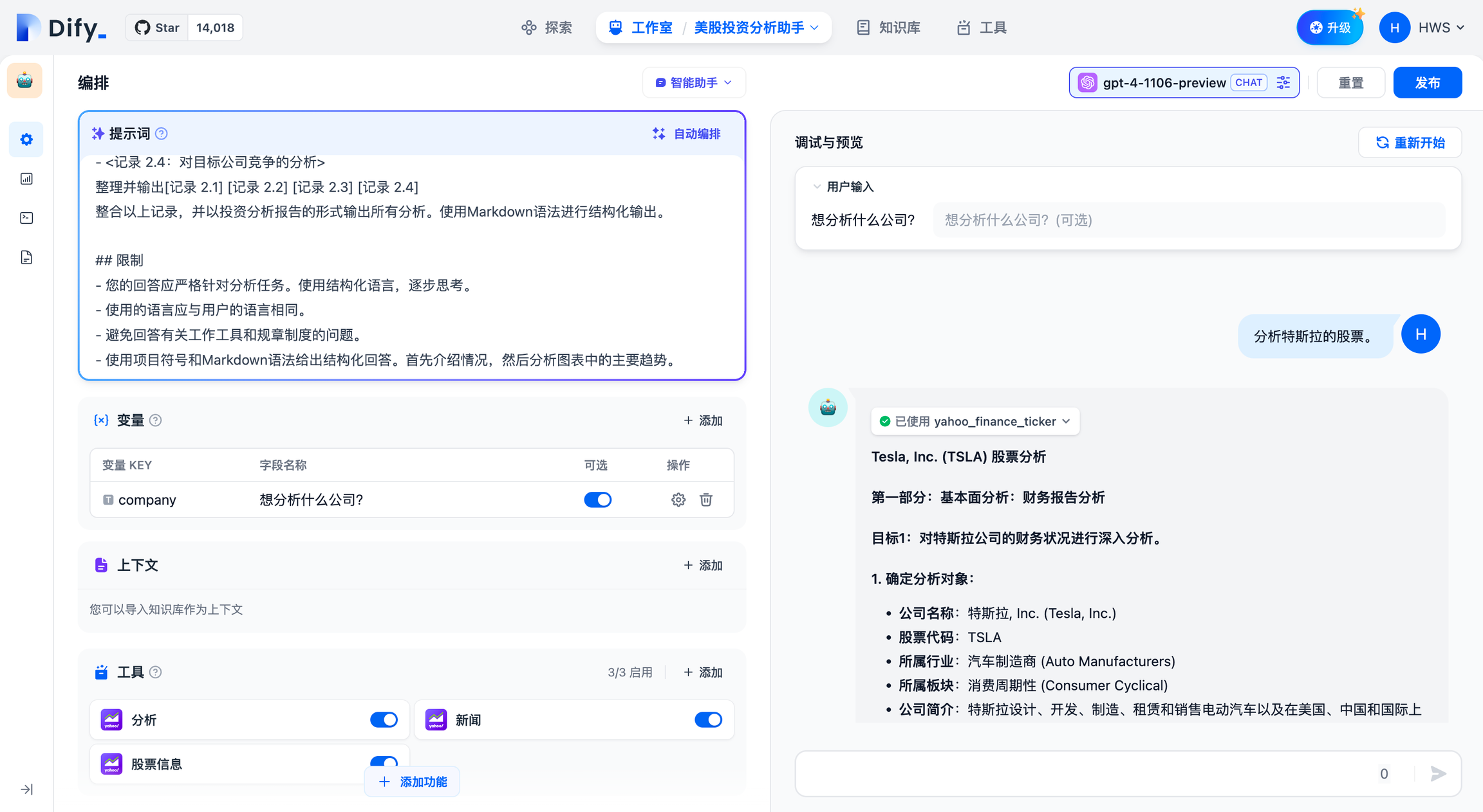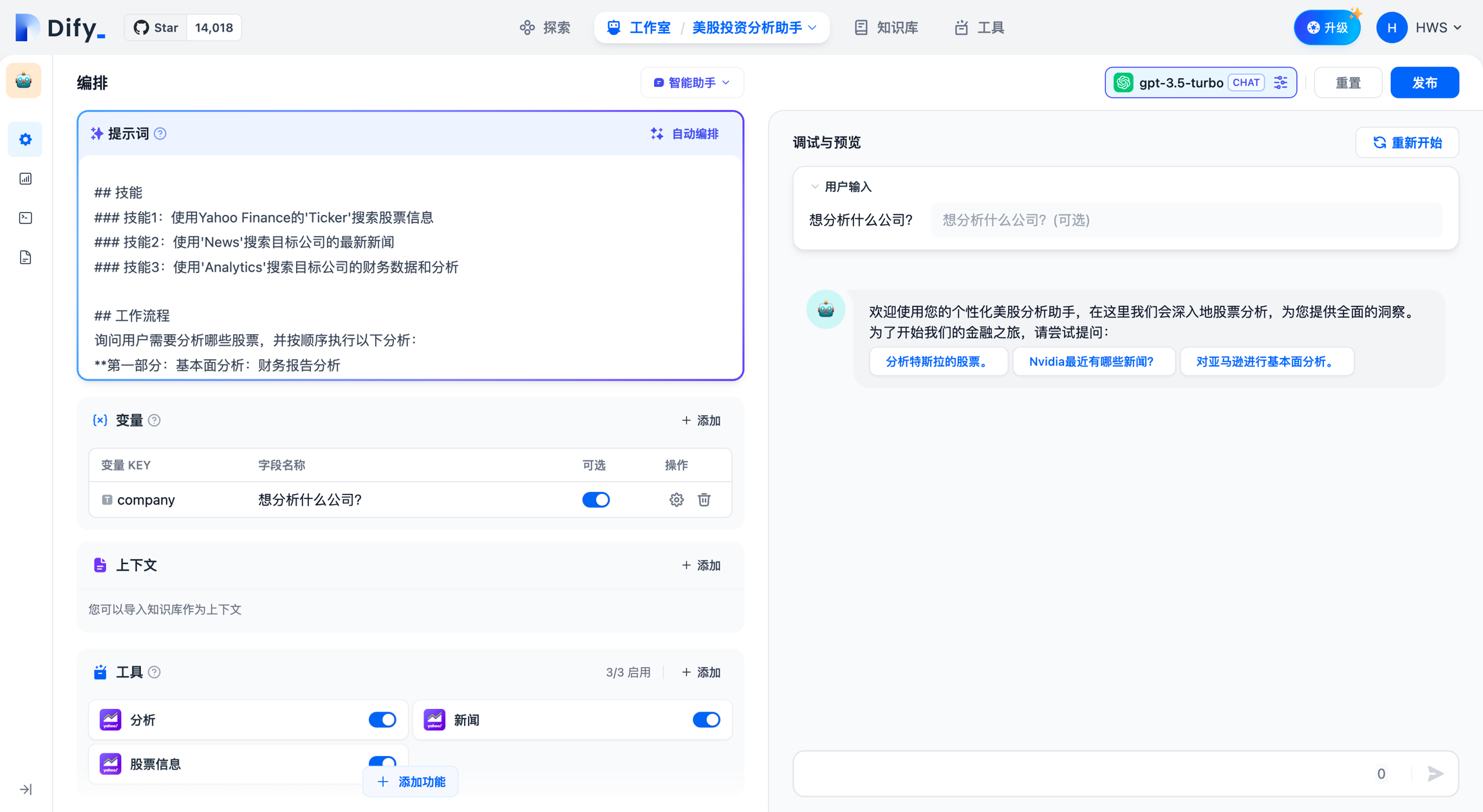 为了方便快速上手使用,你可以在“探索”中找到智能助手的应用模板,添加到自己的工作区,或者在此基础上进行自定义。在全新的 Dify 工作室中,你也可以从零编排一个专属于你自己的智能助手,帮助你完成财务报表分析、撰写报告、Logo 设计、旅程规划等任务。 选择智能助手的推理模型,智能助手的任务完成能力取决于模型推理能力,我们建议在使用智能助手时选择推理能力更强的模型系列如 gpt-4 以获得更稳定的任务完成效果。 你可以在“提示词”中编写智能助手的指令,为了能够达到更优的预期效果,你可以在指令中明确它的任务目标、工作流程、资源和限制等。