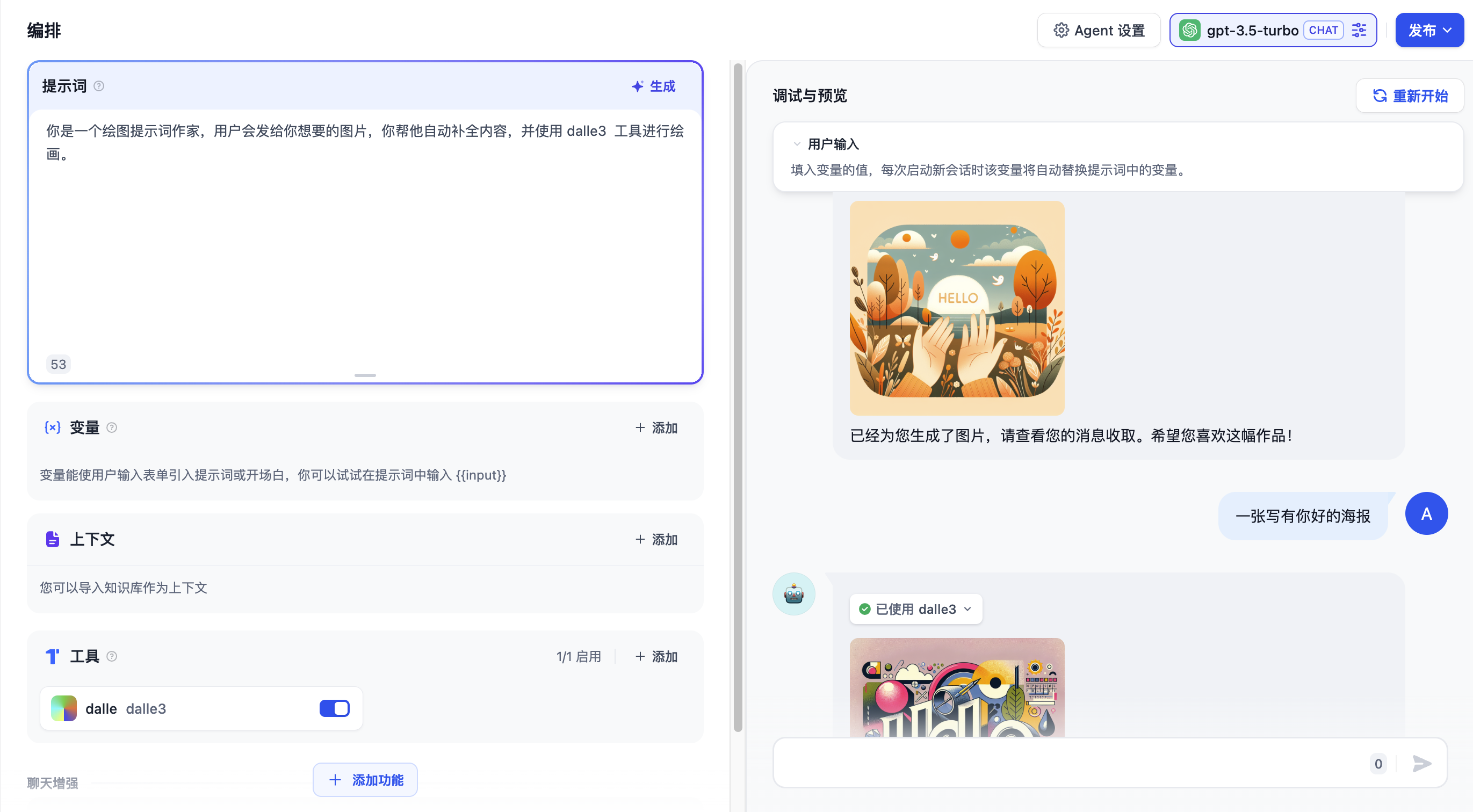 编排完智能助手之后,你可以在发布成应用之前进行调试与预览,查看助手的任务完成效果。