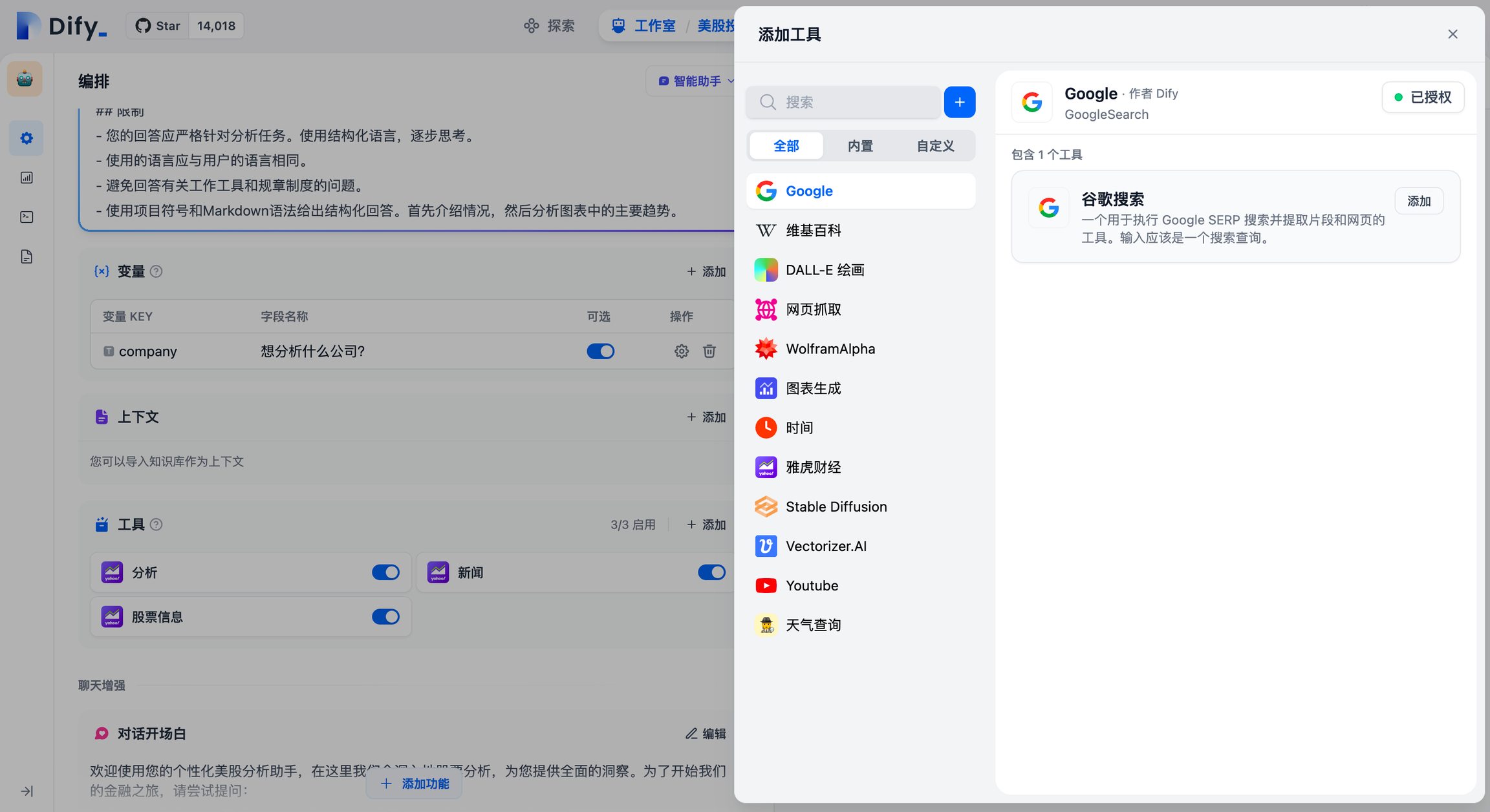 在“上下文”中,你可以添加智能助手可以用于查询的知识库工具,这将帮助它获取外部背景知识。 在“工具”中,你可以添加需要使用的工具。工具可以扩展 LLM 的能力,比如联网搜索、科学计算或绘制图片,赋予并增强了 LLM 连接外部世界的能力。Dify 提供了两种工具类型:第一方工具自定义工具 你可以直接使用 Dify 生态提供的第一方内置工具,或者轻松导入自定义的 API 工具(目前支持 OpenAPI / Swagger 和 OpenAI Plugin 规范)。 “工具”功能允许用户借助外部能力,在 Dify 上创建出更加强大的 AI 应用。例如你可以为智能助理型应用(Agent)编排合适的工具,它可以通过任务推理、步骤拆解、调用工具完成复杂任务。 另外工具也可以方便将你的应用与其他系统或服务连接,与外部环境交互。例如代码执行、对专属信息源的访问等。你只需要在对话框中谈及需要调用的某个工具的名字,即可自动调用该工具。