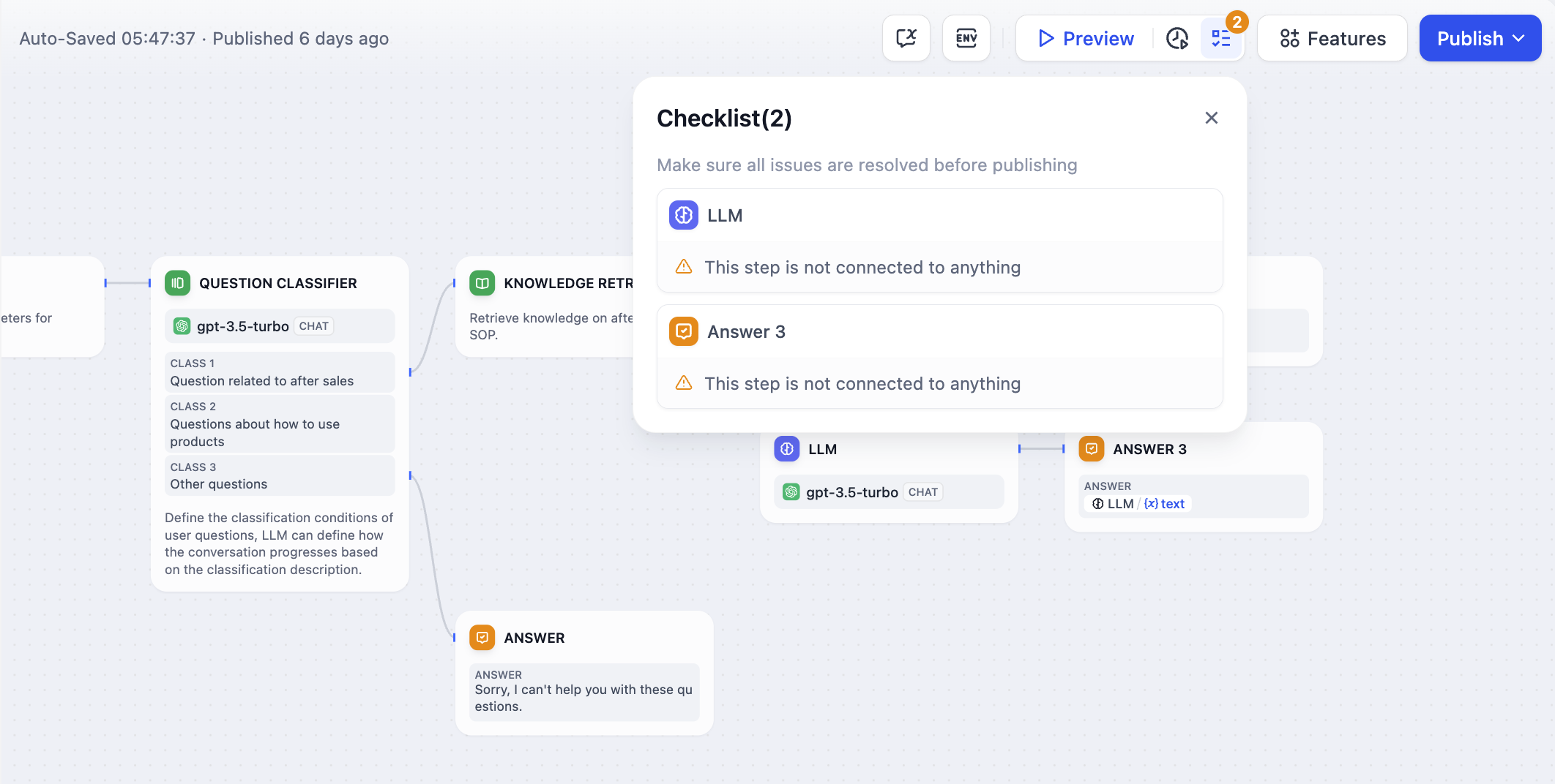 Before publishing the App, you can check the checklist to see if there are any nodes with incomplete configurations or that have not been connected.